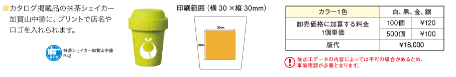 - カタログ掲載品の抹茶ミニシェイカーに、プリントで店名やロゴを入れられます。