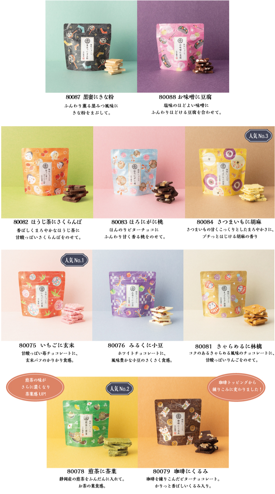 口溶けなめらかな濃厚チョコレートに、慣れ親しんだ和の食材をトッピングしました。